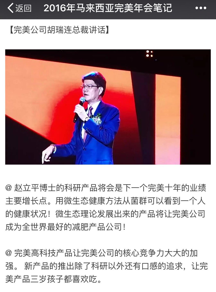 方舟子 ?@fangshimin Apr 23 上海交大赵立平在保健品传销公司“完美”传销大会上讲“完美健康管理模式”,号称其“最有可能获得诺贝尔奖”的项目的产品将由完美公司独家销售。支持科技部否决传销同党的“保健品”项目,谴责《知识分子》力挺传销同党。https://pbs.twimg.com/media/Cgxw8CdUYAARZah.jpghttps://pbs.twimg.com/media/Cgxw8CdUcAEvX7H.jpg
