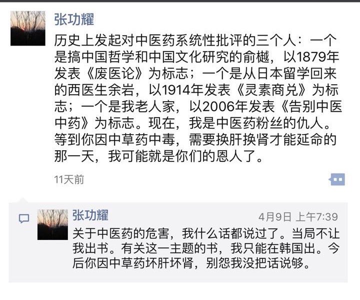 方舟子 ?@fangshimin Apr 21 张功耀自诩是历史上批中医第三人,当今批中医第一人,真伟大啊。不过为什么中医粉都在骂我不骂他啊?https://pbs.twimg.com/media/CgjKV4qVEAAH4Kq.jpg