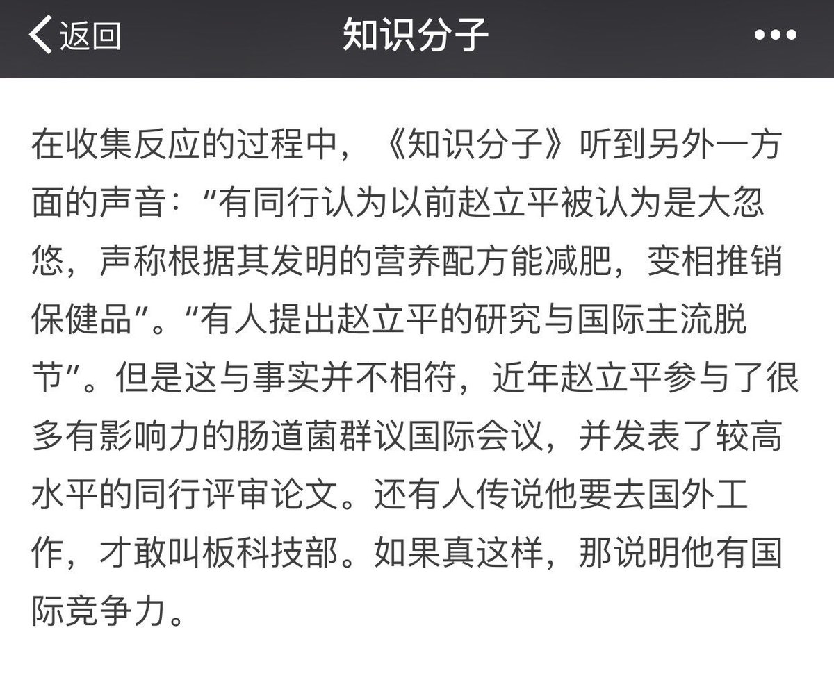 方舟子 ?@fangshimin Apr 22 《知识分子》竟赤裸裸地力挺大忽悠赵立平。赵立平被科技部否决的是其“保健食品”项目,跟他以其基础研究结果参加国际会议、发表论文有什么关系?难道《知识分子》认为做过获得国际学术界认可的基础研究工作,就有了权利研发“好细菌”保健品忽悠人?https://pbs.twimg.com/media/CgsFc-pUUAEEl4s.jpg