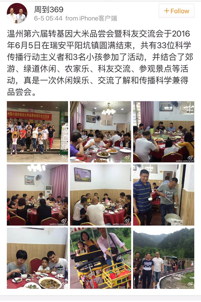 方舟子 ?@fangshimin Jun 6 温州本届转基因大米品尝会参加人数果然比历届都多。https://pbs.twimg.com/media/CkUeDouVAAAzmWB.jpg