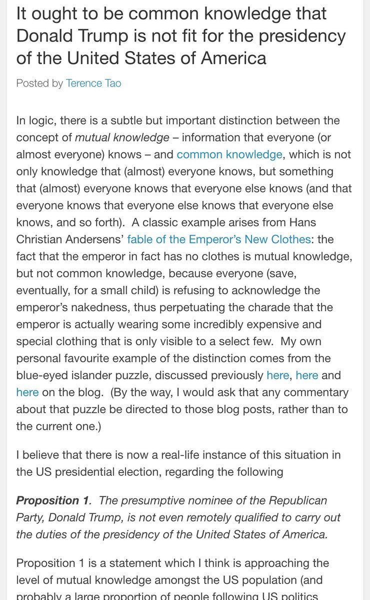 方舟子 ?@fangshimin Jun 7 陶哲轩提出一条定理:“川普不适合当总统。”他说几乎所有人都对此心知肚明(连川普的许多支持者也知道),是个“互识”,但是由于种种原因不是人人说得出口的“共识”,就像皇帝的新衣。https://terrytao.wordpress.com/2016/06/04/it-ought-to-be-common-knowledge-that-donald-trump-is-not-fit-for-the-presidency-of-the-united-states-of-america/ …https://pbs.twimg.com/media/CkZP7_lVAAA9NWh.jpg