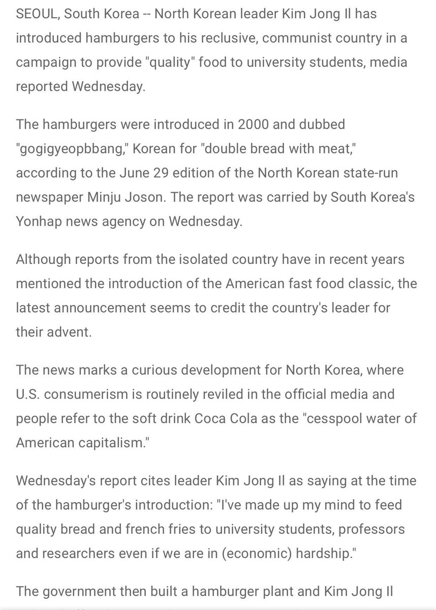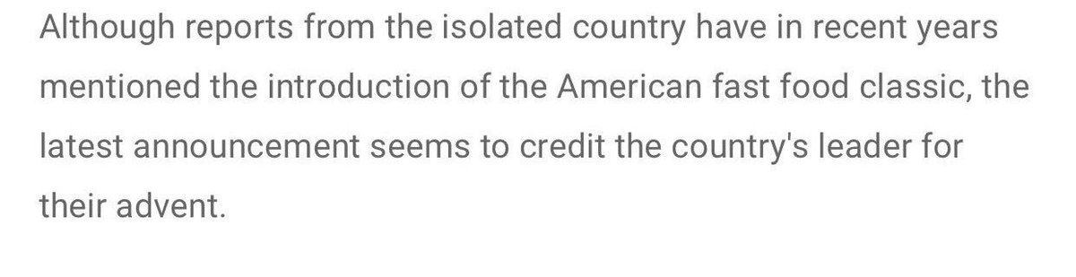 方舟子 ?@fangshimin Jun 8 “虽然近年来该孤立国家的报道提到这种美国经典快餐的采用,但最新的宣布似乎将它们的问世归功于该国领导人。”如果“问世”像方黑说的只是指该食品的采用,朝鲜原报道已明确说了它是金正日下令生产的,哪里用得着“似乎”?是不是他发明的才“似乎”https://pbs.twimg.com/media/CkeQSPtUkAAulvZ.jpg