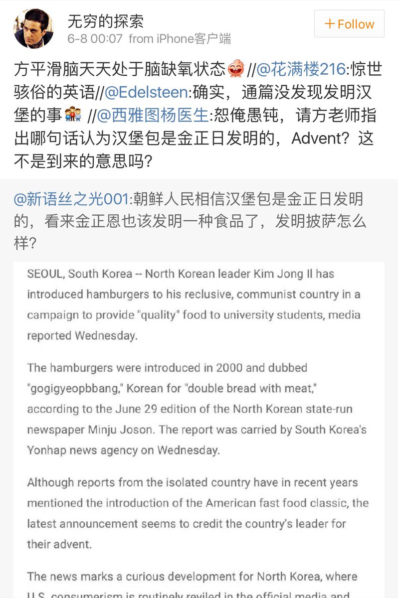 方舟子 ?@fangshimin Jun 8 其实这篇报道的标题就叫North Korean Leader Claims He Invented Hamburgers(北朝鲜领导人声称他发明汉堡包),我为了多截内容省略标题,哪知道钓出西雅图老中医、无穷大脑凹、捣蛋之渣一堆“英语草根高手”。