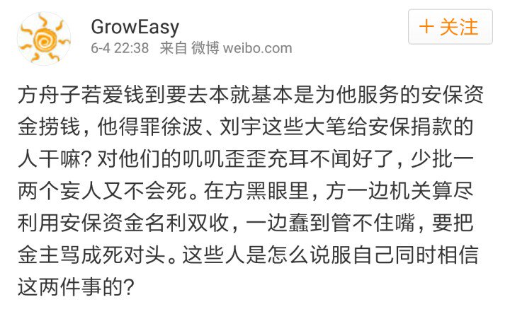 方舟子 ?@fangshimin Jun 8 这些人不只是蠢,是坏。@look1m 他们根本不需要相信,只需一会排成S型说方舟子爱财如命啥钱都贪,一会再排成X型说方舟子毫无情义啥人都打连徐波都不放过,就可以了。更可笑的是,他们还能说服自己相信方舟子为了贪钱还要被彭剑扒层皮搞走一半。不是蠢成渣,而是渣到连脑子都不要。
