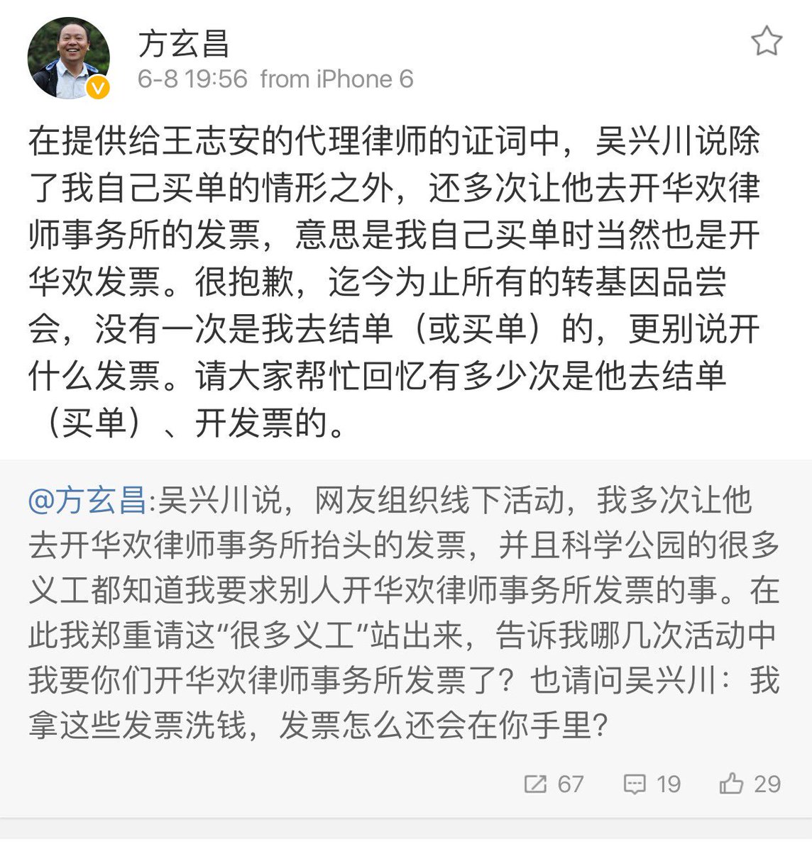 方舟子 ?@fangshimin Jun 10 凭空诬陷当然没有证据,当然只能扯无关事情。@hqabc 王志安现在已经开启说胡话模式了。法庭要他提供方玄昌用转基因品尝会发票洗钱的证据,他却扯其它的事情。中国法官素质的确不高,但明显的要说A,你提供B,这简单的判断应该不会出错。肖传国坑了N多人,王志安肯定会超越。