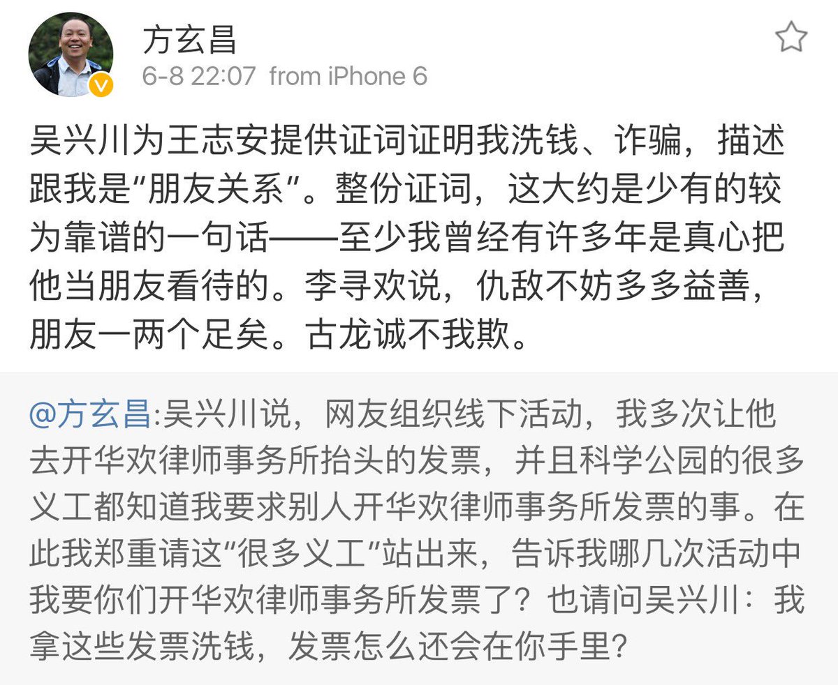 方舟子 ?@fangshimin Jun 9 以后谁还敢要吴兴川这种回头就撒谎咬你一口的背信弃义的“朋友”啊?也许就王志安敢要?https://pbs.twimg.com/media/CkflUn7WYAALsch.jpg