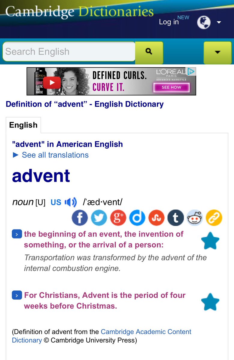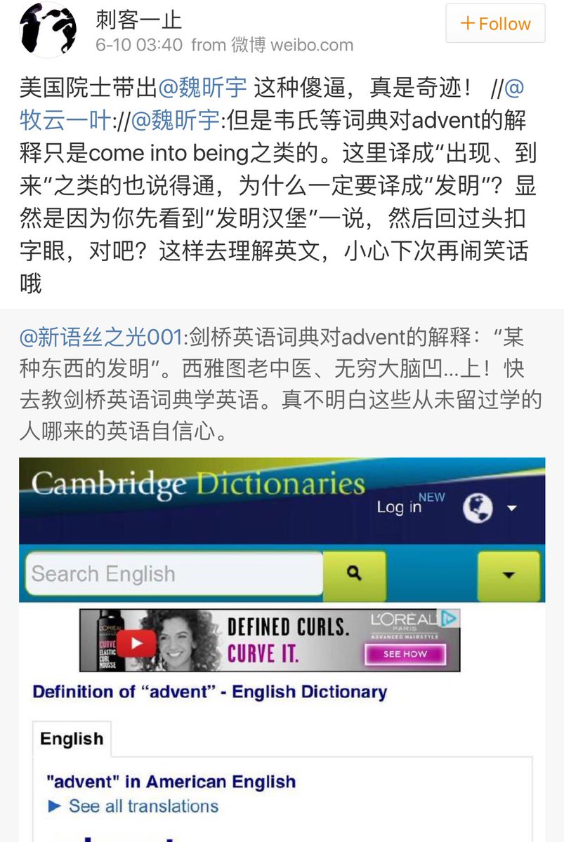 方舟子 ?@fangshimin Jun 9 剑桥英语词典对advent的解释:“某种东西的发明”。西雅图老中医、无穷大脑凹…上!快去教剑桥英语词典学英语。真不明白这些从未留过学的人哪来的英语自信心。https://pbs.twimg.com/media/CkkS9MzWYAAewTy.jpg