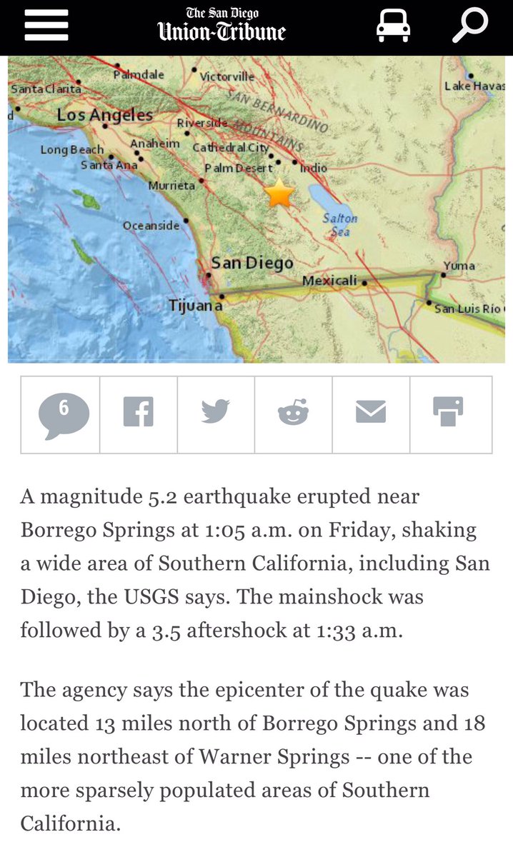 方舟子 ?@fangshimin Jun 10 离断层一百多公里,受的影响小。没有飓风、龙卷风、洪水,唯一有威胁的自然灾害是野火。@cktears 相较加州其它几个大城市,圣迭哥还算是地震威胁比较小的,没有断层直接穿过。小阵多一点释放一下能量反而更好。