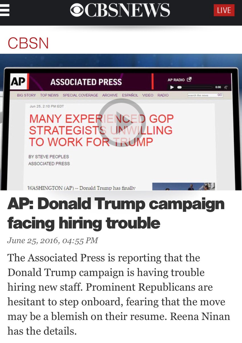 方舟子 ?@fangshimin Jun 25 川普把他的竞选经理开除后,找不到人来顶替,因为共和党策略家们都不愿跟他沾上,怕成为履历上的污点。我早说了,他可以去中国招聘,那里川粉众多,而且对他信心满满的。https://pbs.twimg.com/media/Cl2jJAdVAAElMme.jpg