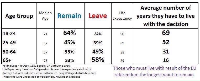 方舟子 ?@fangshimin Jun 24 看看英国公投选择的年龄分布,反映出公投的一个弊端就是没有几年可活的老人让年轻人为自己的自私和短视买单。https://pbs.twimg.com/media/CluP5JuVYAAlRLk.jpg