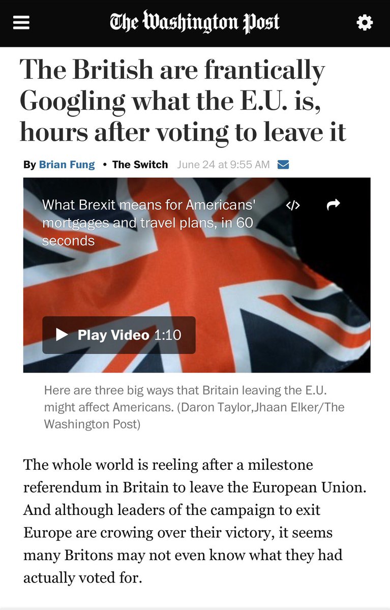 方舟子 ?@fangshimin Jun 24 很多投票脱欧的英国人在投票结束后才紧急搜索“欧盟”是什么东西,后悔也来不急了。极右势力最喜欢这种愚民,很容易就用民族主义、民粹主义煽乎起来。卡梅伦为了连任答应搞公投,低估了极右势力影响。https://www.washingtonpost.com/news/the-switch/wp/2016/06/24/the-british-are-frantically-googling-what-the-eu-is-hours-after-voting-to-leave-it/ …https://pbs.twimg.com/media/ClwsAezVEAAg7ue.jpg