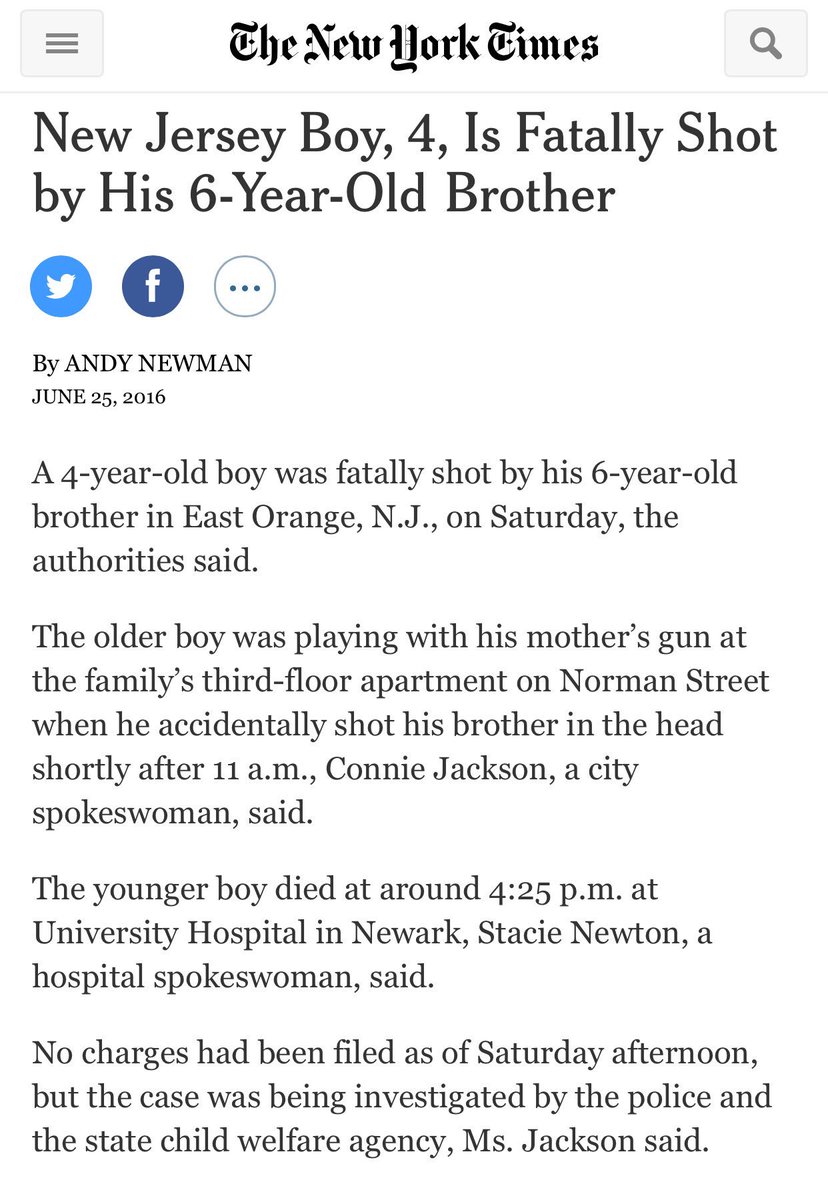方舟子 ?@fangshimin Jun 27 新泽西州一名6岁男孩玩他妈妈的枪走火,杀了他4岁的弟弟。https://pbs.twimg.com/media/CmA4mwIWMAAvSNx.jpg