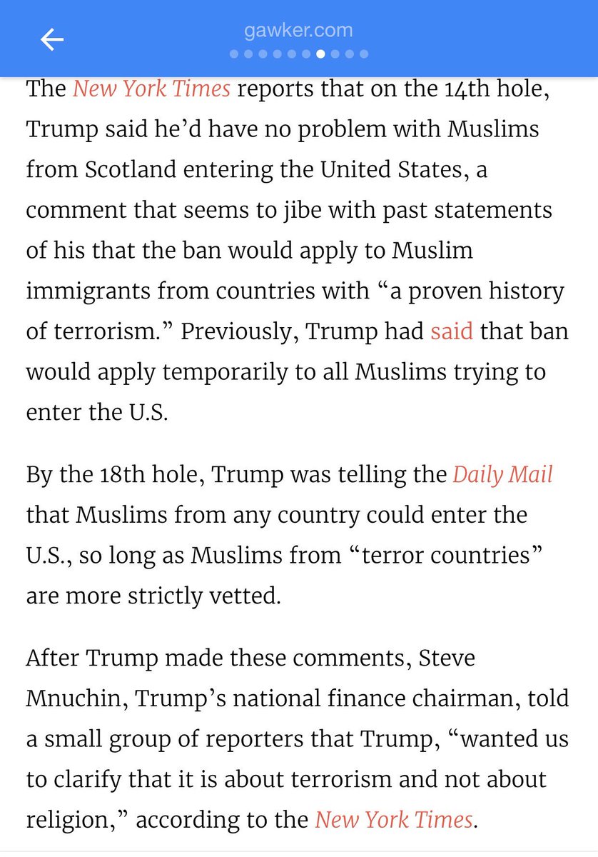 方舟子 ?@fangshimin Jun 27 一场高尔夫球没打完,观点就变了,真实际。对川粉来说,他说什么,怎么变,都会叫好的,他要禁穆斯林入境叫好,不禁了也叫好,反伊斯兰教叫好,不反了也叫好,都有理。@cniuv 为他叫好!说明他是可以纠正自己偏激的倾向的。何况他本人原本就是很实际的,pragmatic的。