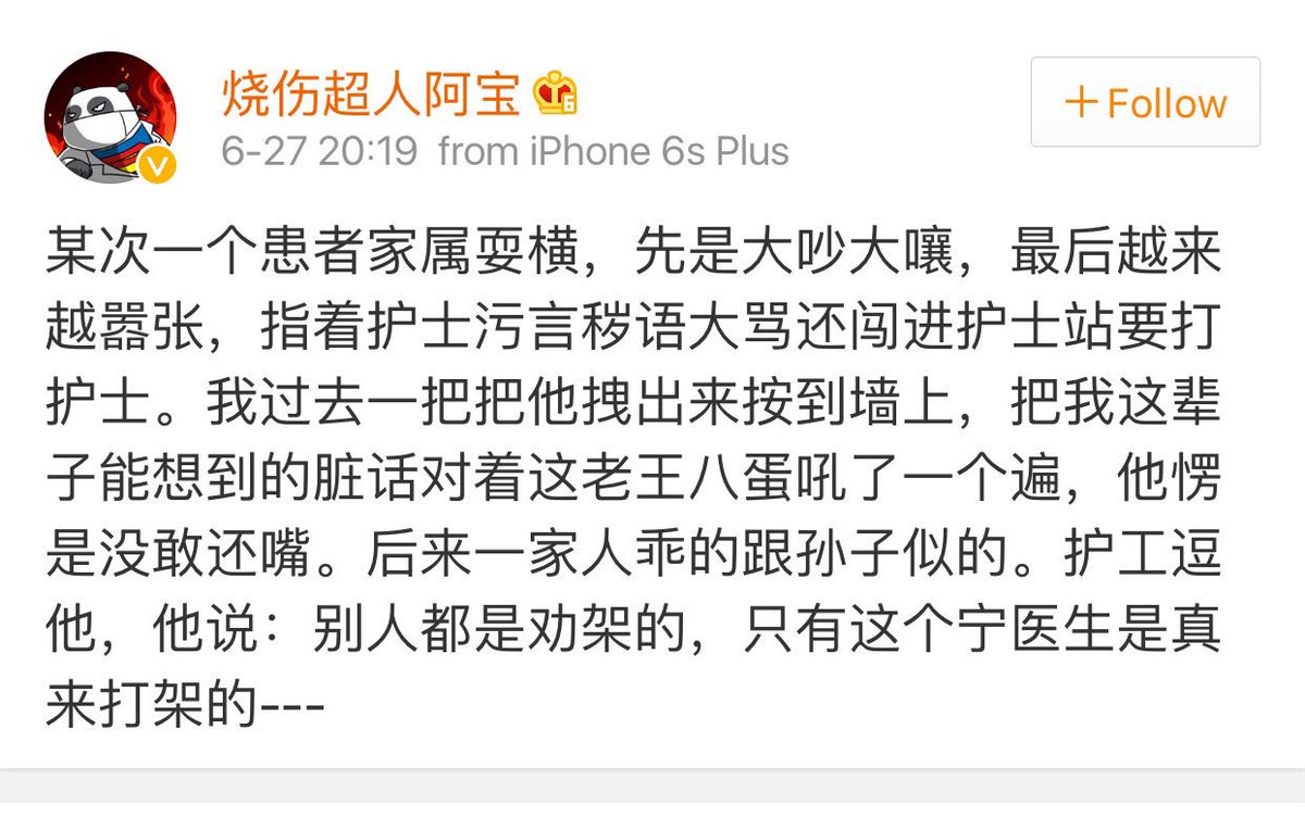 方舟子 ?@fangshimin Jun 27 这次烧伤宝是用螳螂拳打老人,所以手指没断,真威武。https://pbs.twimg.com/media/CmBBU-0WkAATUXi.jpg