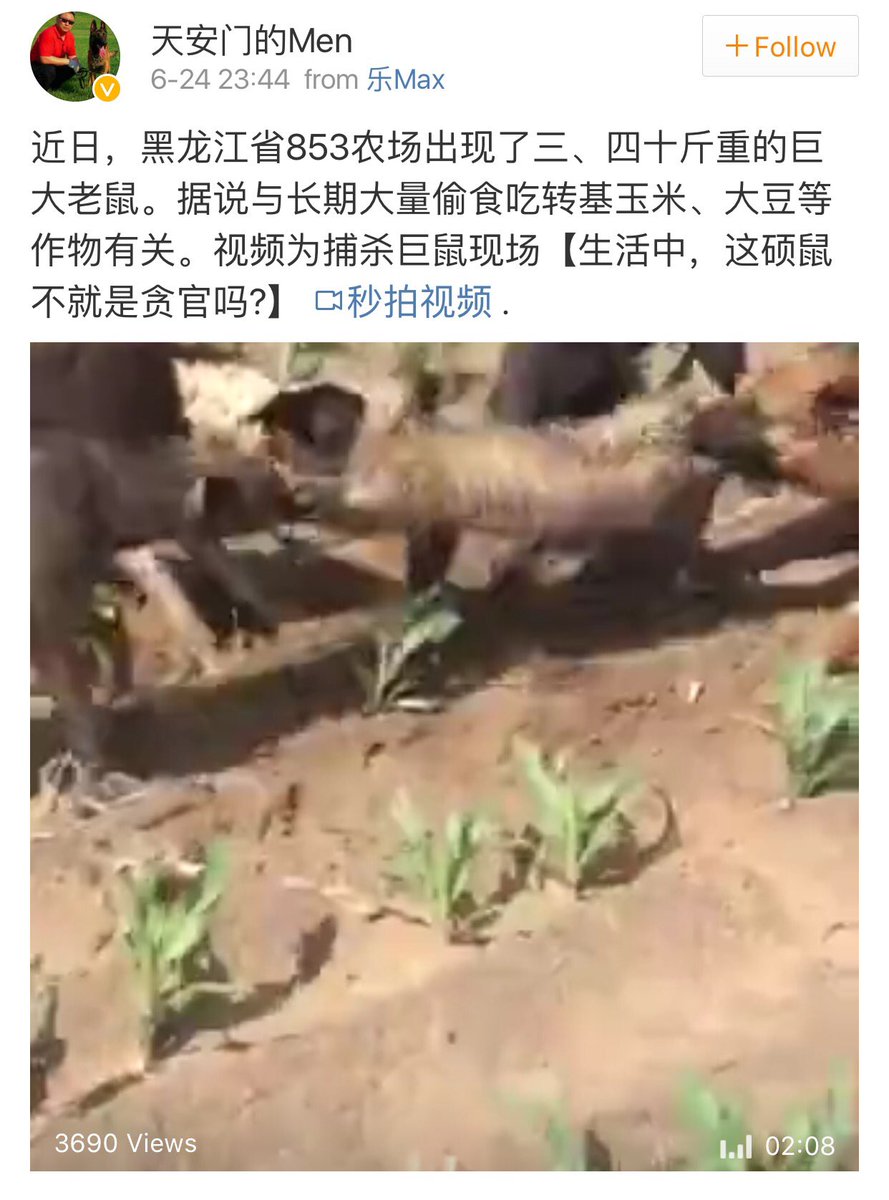 方舟子 ?@fangshimin Jun 28 反转控以前造谣说转基因玉米让老鼠绝迹,现在又造谣说转基因玉米让老鼠变成了巨大老鼠(其实是旱獭),这转基因玉米真是神奇,吃了能搞死你也能让你变巨人。https://pbs.twimg.com/media/CmBZDVBXEAA--37.jpg