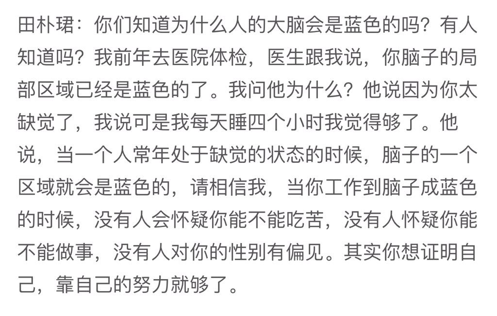 方舟子 ?@fangshimin Jun 29 田朴珺是不是去医院做了一个功能核磁共振成像?它在数据处理上用蓝色表示大脑某个区域血氧供应少、不活跃,不是说大脑真的变成蓝色。我想知道的是,究竟常年缺觉会让大脑哪个区域变得不活跃?https://pbs.twimg.com/media/CmLge90VEAA1iWT.jpg