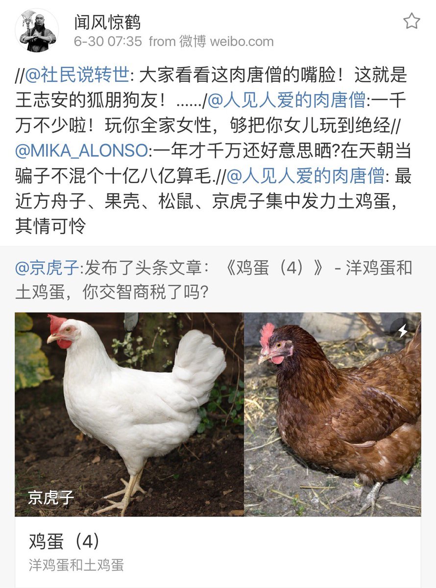 方舟子 ?@fangshimin Jun 30 土鸡蛋一年卖了千万,这是散养了几万只土鸡,还是一个土鸡蛋卖了几十几百块钱?就这还敢口口声声说人“诈骗”。当然,“堂堂央视记者”王志安同志每一个诽谤我“诈骗”“骗子”的帖子我都会追究,造谣也就一时爽,急什么。https://pbs.twimg.com/media/CmNJIbuUsAQW_-_.jpg