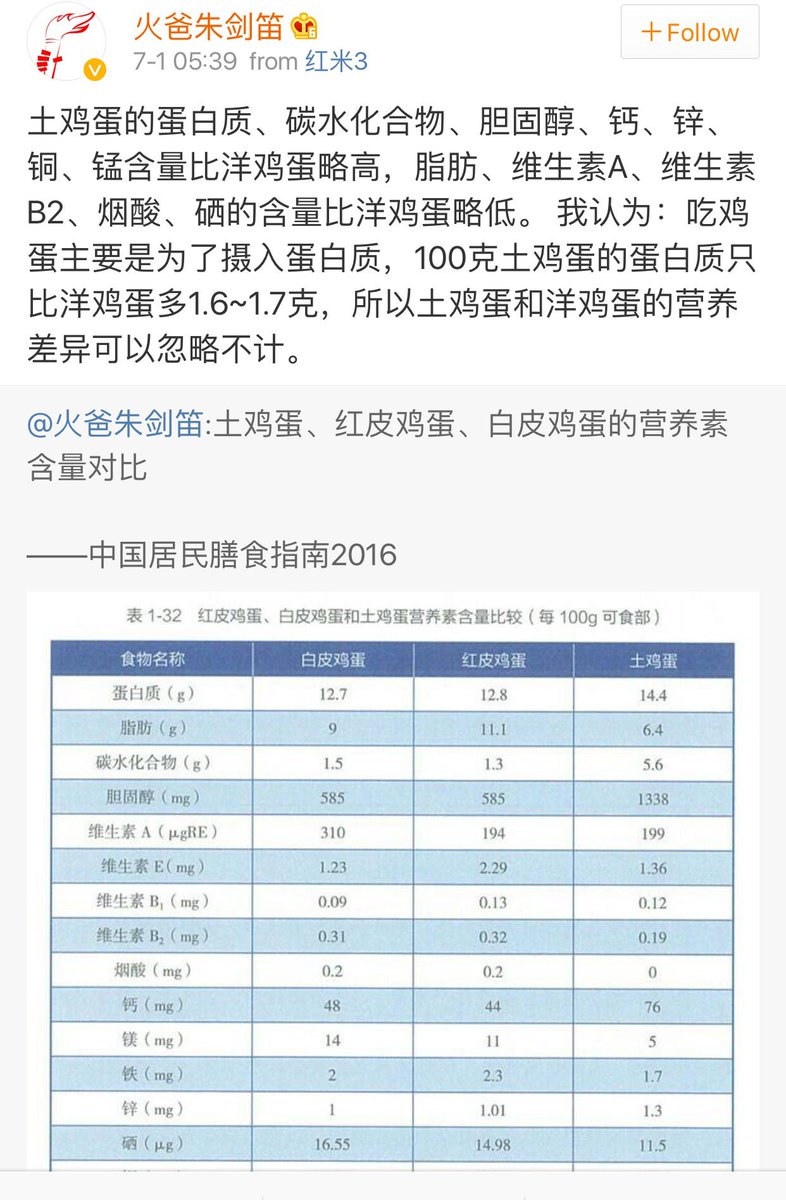 方舟子 ?@fangshimin Jul 2 服装专业的又把自己当营养专家了?鸡蛋是营养丰富的食品,富含多种维生素、矿物质,吃鸡蛋并不只是“主要是为了摄入蛋白质”。当然,土鸡蛋与普通鸡蛋在营养方面并无实质差别。https://pbs.twimg.com/media/CmV7yLfUsAAUFEe.jpg