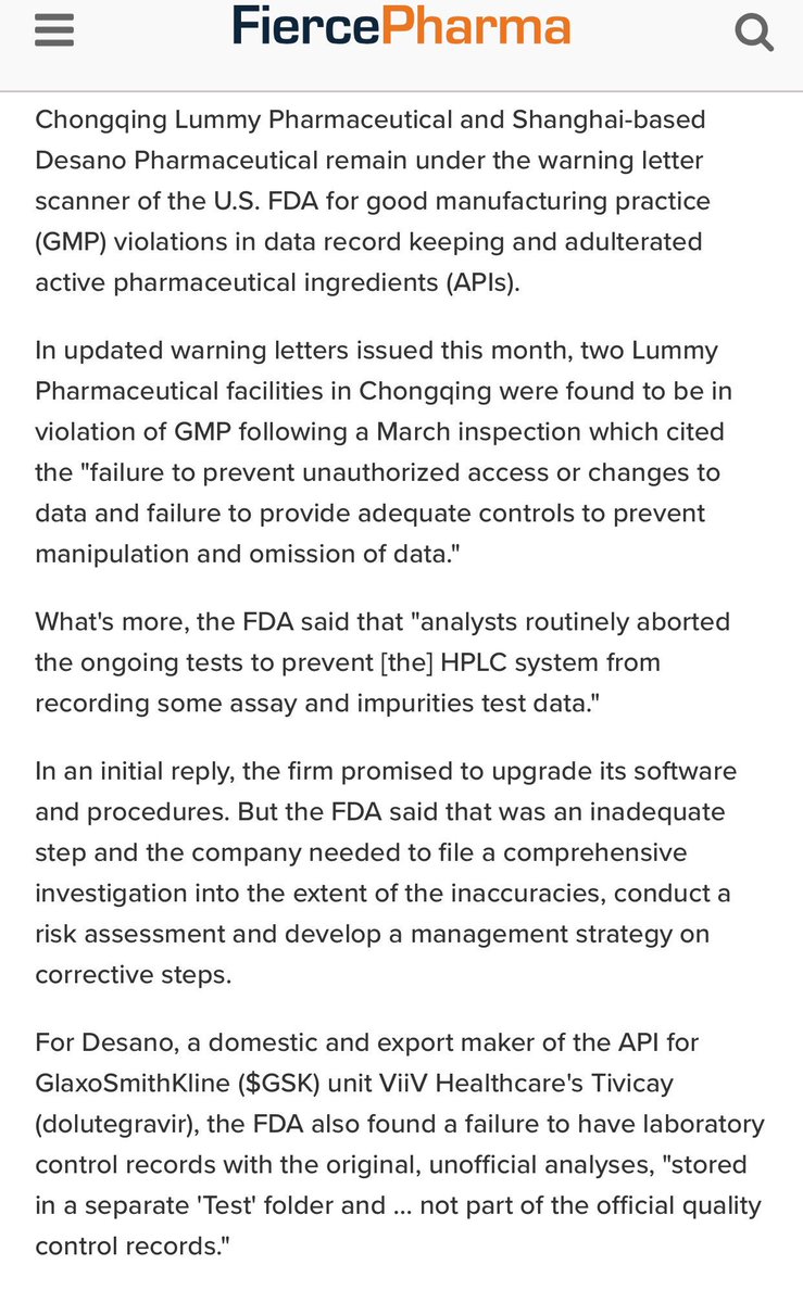 方舟子 ?@fangshimin Jul 1 FDA给两家中国药厂(重庆莱美药业和上海迪赛诺)发去警告信,认为其数据记录和药物成分存在问题。这两家药厂主要在国内卖药,但也向美国出口原料,所以FDA要管。https://pbs.twimg.com/media/CmVujRHUIAAeFB1.jpg