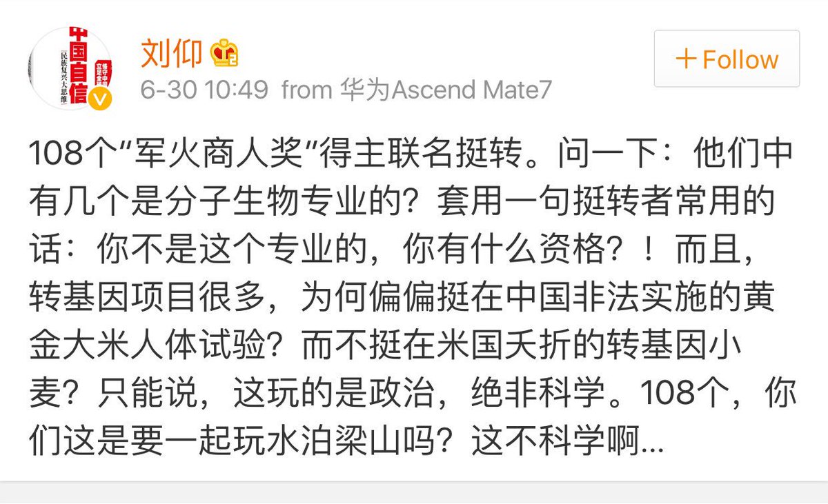 方舟子 ?@fangshimin Jul 5 百位诺贝尔奖获得者力挺金大米,被这个署名放前面的当成是反对的了? || @覃家村覃大叔(@shi512517): 煞笔,还不快去打俄罗斯的脸去?还有那百位科学家的脸去?