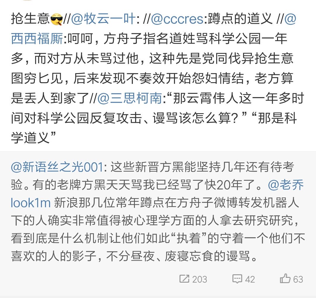 方舟子 ?@fangshimin Jul 2 这些新晋方黑能坚持几年还有待考验。有的老牌方黑天天骂我已经骂了快20年了。@look1m 新浪那几位常年蹲点在方舟子微博转发机器人下的人确实非常值得被心理学方面的人拿去研究研究,看到底是什么机制让他们如此“执着”的守着一个他们不喜欢的人的影子,不分昼夜、废寝忘食的谩骂。