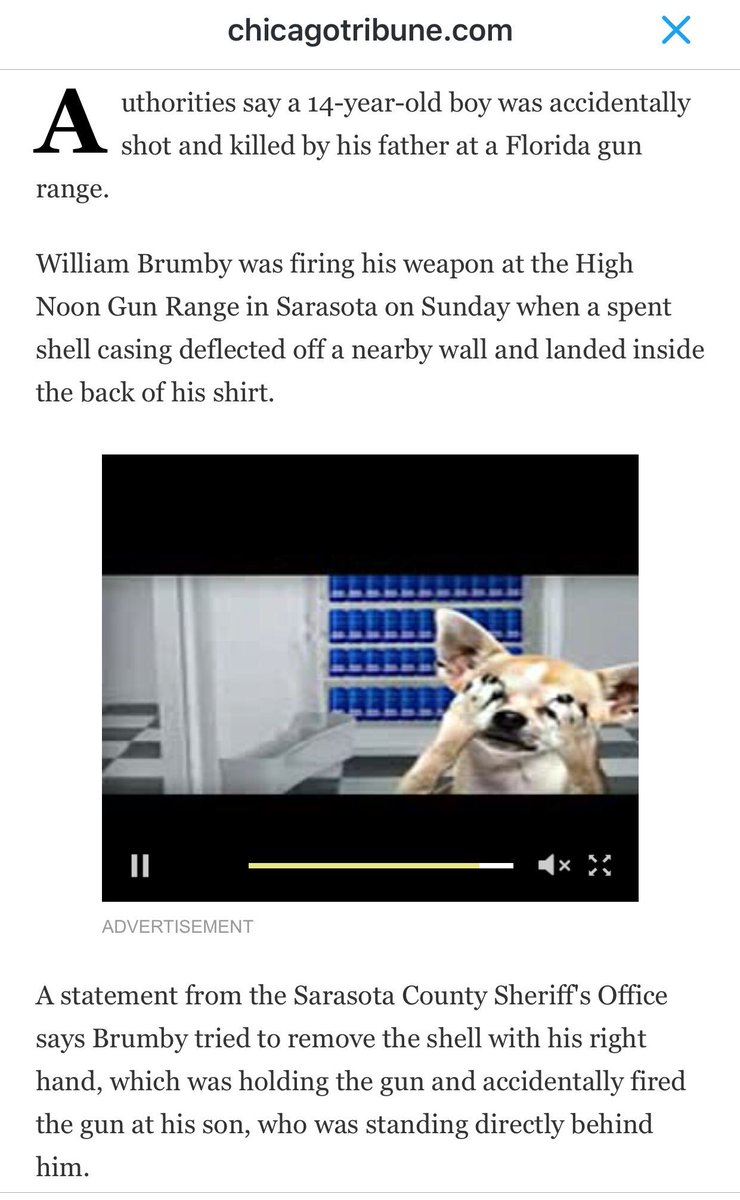 方舟子 ?@fangshimin Jul 4 这种悲剧会越来越多。在佛罗里达一个射击场,一个弹壳跳进一名男子的衬衫后面,他想把这个弹壳拿掉时,手上的枪走火,杀了站在身后的14岁儿子。https://pbs.twimg.com/media/CmlHWL-UEAAmQQ5.jpg