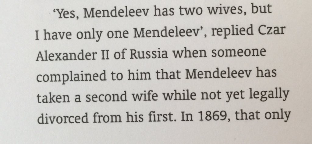 方舟子 ?@fangshimin Jul 5 有人向沙皇举报门捷列夫还没离婚就娶了新老婆,沙皇说:“是,门捷列夫有两个妻子,而我只有一个门捷列夫。”这意思是大科学家可以重婚?https://pbs.twimg.com/media/Cmp30DcWEAEOkH_.jpg