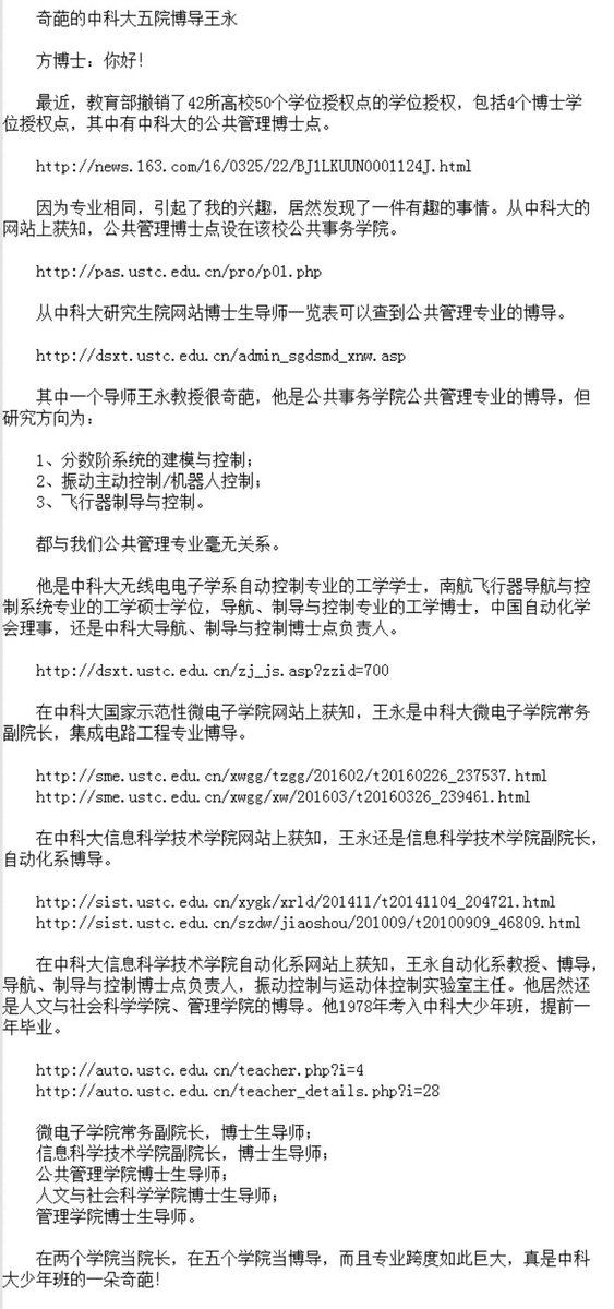 方舟子 ?@fangshimin Jul 5 中国科大教授王永在微电子学院、信息科学技术学院两个学院当院长,在微电子学院、信息科学技术学院、公共管理学院、人文与社会科学学院、管理学院五个学院当博导,专业跨度如此巨大,真是中科大少年班出来的天才。https://pbs.twimg.com/media/CmqH6c_WgAA-GBO.jpg