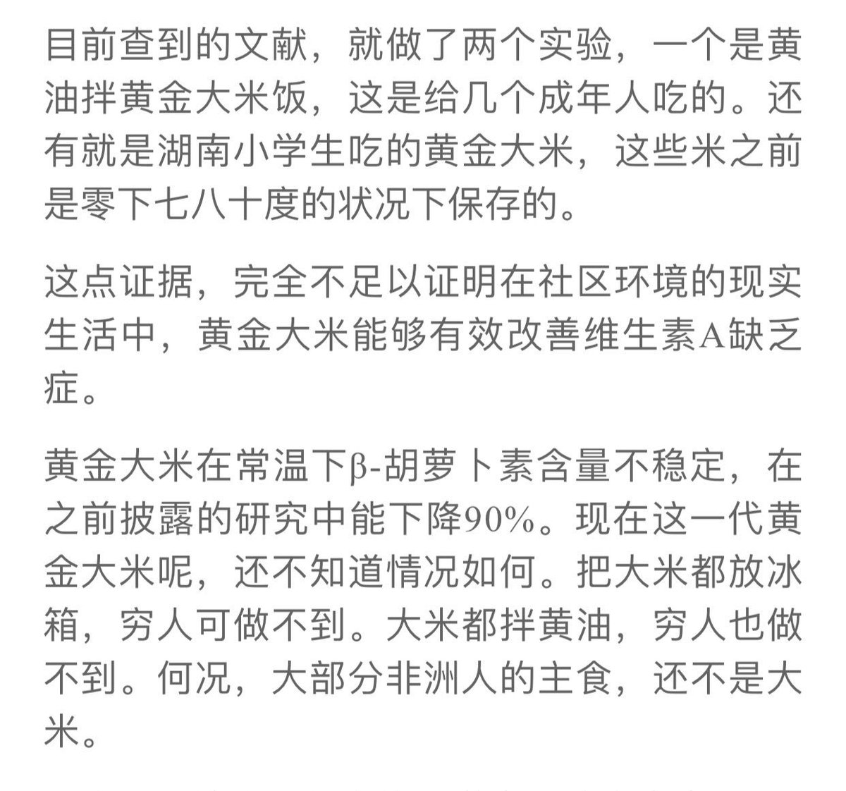 方舟子 ?@fangshimin Jul 8 崔永元说2两金大米里的胡萝卜素含量等于2两胡萝卜,数量明显不占优势。奇怪,都是二两,怎么不占优势了?而且关键是,二两金大米里的胡萝卜素已足够满足一个人一天的维生素A需求了,不需要再去啃胡萝卜了。它本来就是为吃不到胡萝卜的穷人研发的。https://pbs.twimg.com/media/Cm0x9uEVMAE1HdT.jpg