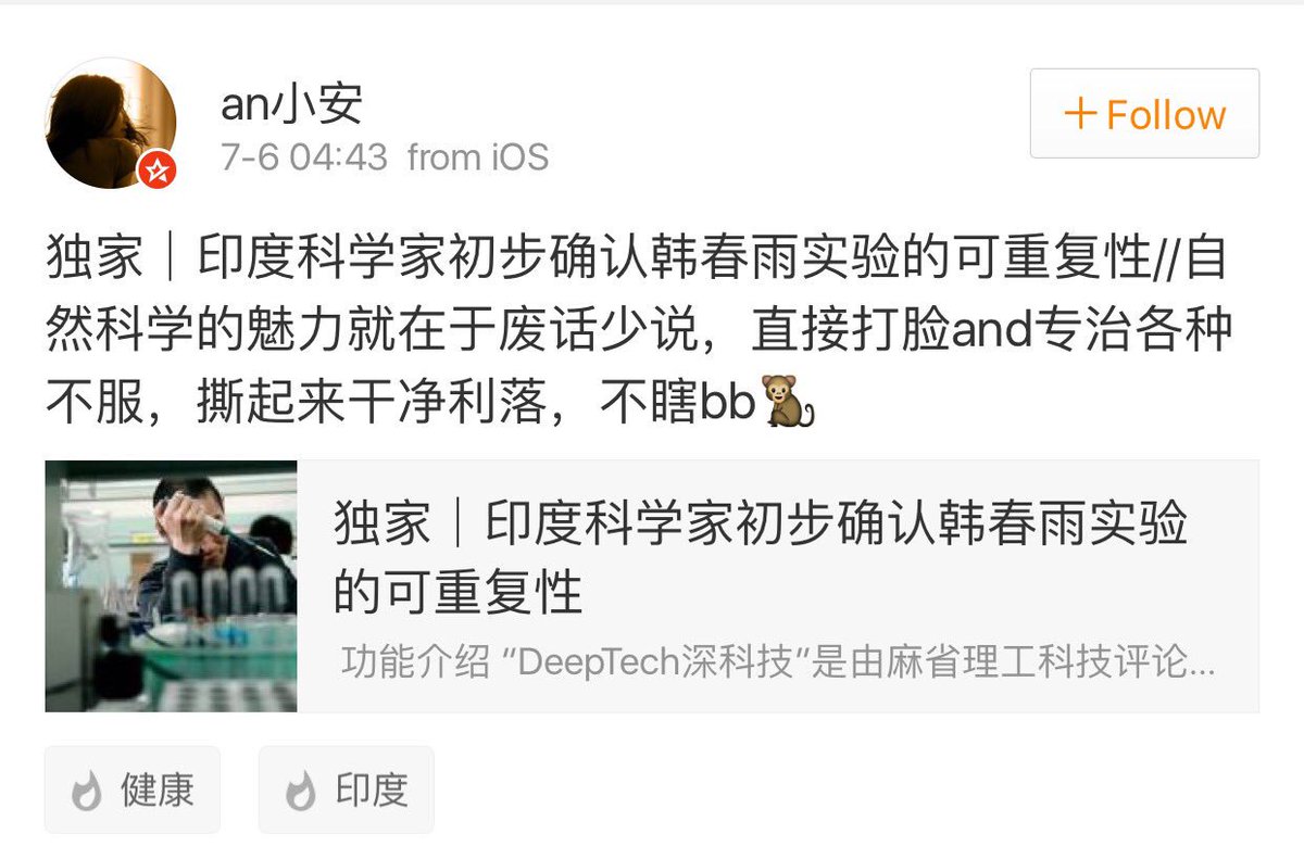 方舟子 ?@fangshimin Jul 10 现在还不能说已经有定论。那个号称重复出结果的印度人的测序结果出来了没有?@owlishx 党对韩春雨密集式的吹嘘消停了。@fangshimin 老师三个问题,就结束了这一场乌烟瘴气。四两拨千斤啊。