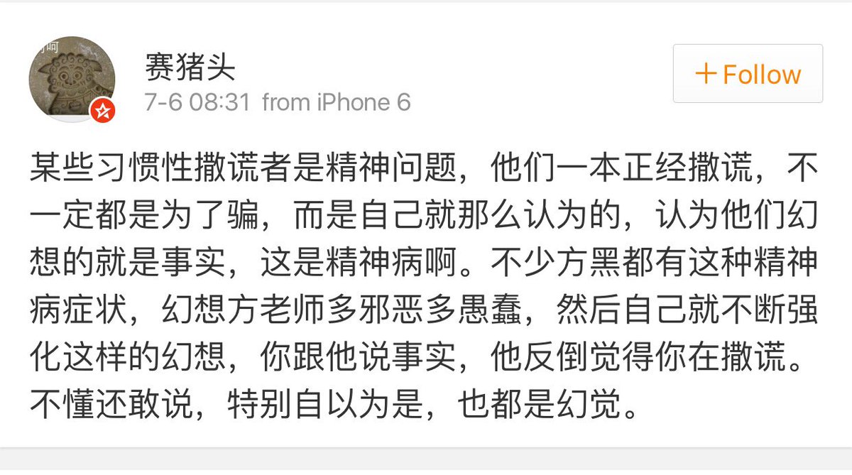 方舟子 ?@fangshimin Jul 6 这个就叫病理性说谎者,说谎说得自己都分不清谎言和事实了。https://pbs.twimg.com/media/CmvH6cCUkAAZrEc.jpg