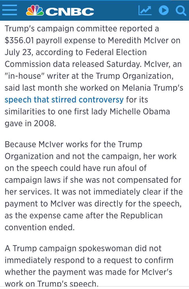 方舟子 ?@fangshimin Aug 21 给川普夫人写演讲稿的那个人获得的稿酬是$356.01,这么便宜,难怪抄奥巴马夫人的演讲交差。多出的那一分不知怎么回事,难道还代扣税了?https://pbs.twimg.com/media/CqbwRvIVYAASrAB.jpg