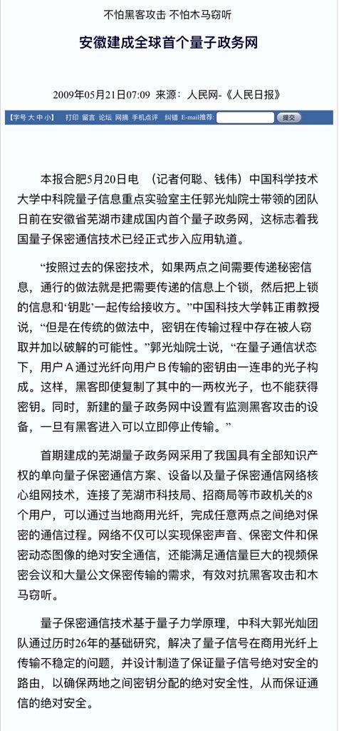 方舟子 ?@fangshimin Aug 22 原来中国应用量子保密通信技术已经整整七年了,号称在芜湖搞了首个“不怕黑客攻击不怕木马窃听”的量子政务网。如果量子通信已经那么好使,七年来怎么没见在别的城市建第二个?反而想着上天去试验?https://pbs.twimg.com/media/Cqc1qPIUMAEDqNh.jpg
