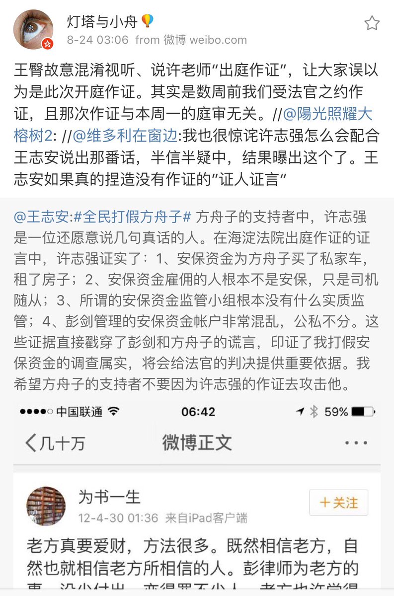 方舟子 ?@fangshimin Aug 25 许老师是因方玄昌刑事自诉王志安涉嫌诽谤罪一案去给方玄昌作证,却被王志安歪曲成给我起诉他的案子出庭作证还对我不利,“堂堂央视记者”这种混淆视听的手段大家早见惯了。https://pbs.twimg.com/media/Cqw0j6jW8AA8WJX.jpg