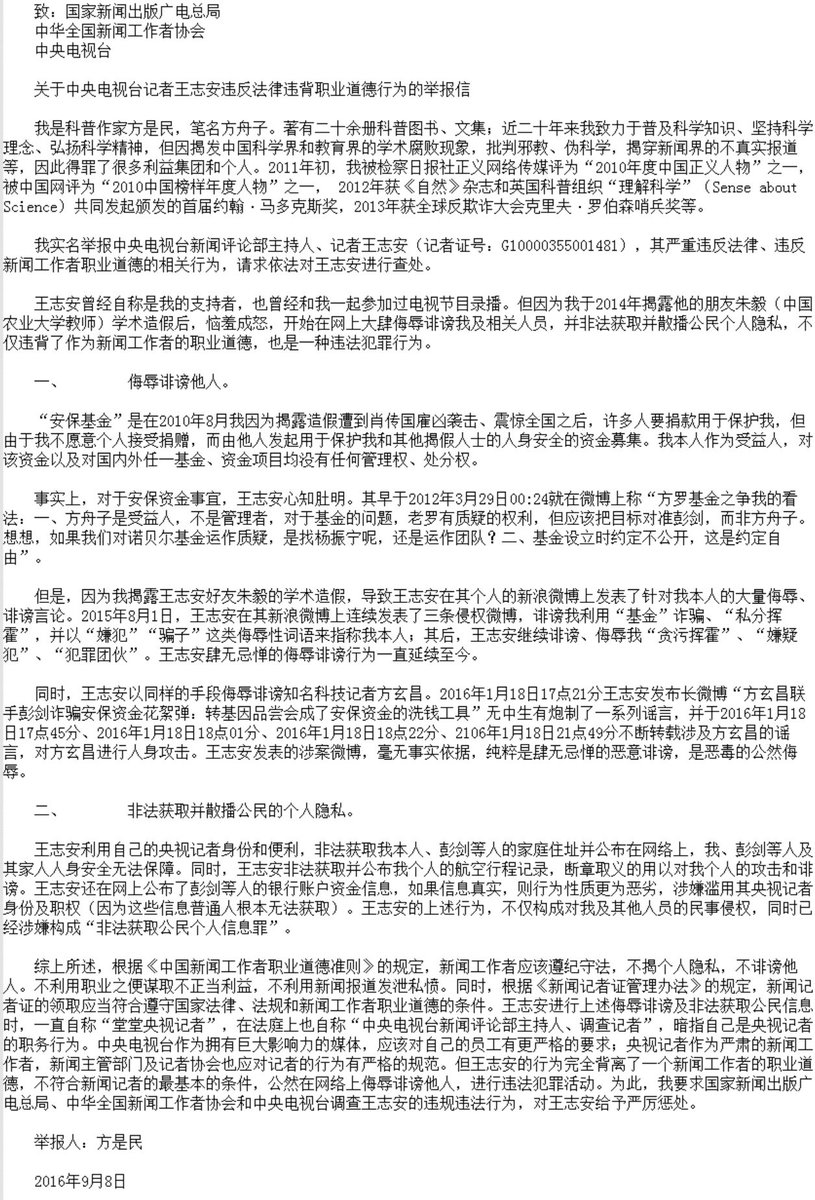 方舟子 ?@fangshimin Sep 12 因王志安向北京司法局、律师协会举报王律师、彭律师,来而不往非礼也,我也让律师起草了向广电总局、记者协会、中央电视台举报王志安违反法律违背职业道德行为的举报信。https://pbs.twimg.com/media/CsMv2hfUEAAlLSd.jpg