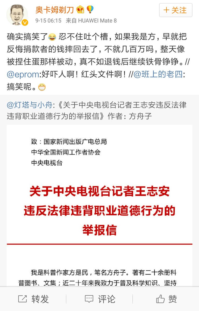 方舟子 ?@fangshimin Sep 15 叨叨和科骗合流了?还是一贯的愚蠢,以为那是捐给我本人的钱呢。@look1m
