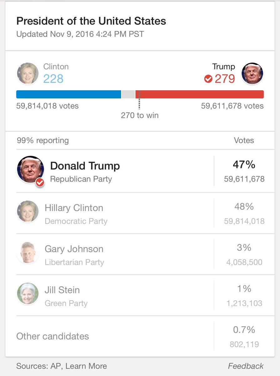 方舟子 ?@fangshimin Nov 8 还是我大加州最牛,投票一结束,马上宣布希拉里获胜。有的投票站就设在私人住宅的车库。不过加州再牛也不行,现在看来川普已赢得所有摇摆州,就像我昨天说的,那就要看生锈带的密歇根、威斯康星和宾州了。但这三州目前结果都很接近,希拉里不乐观。这回是对现实不满的白人蓝领跟着一个骗子起来造反。https://pbs.twimg.com/media/Cwyva-IVEAAkGTW.jpghttps://pbs.twimg.com/media/Cwyva-IUsAAI8XO.jpghttps://pbs.twimg.com/media/Cwyva-GVQAA9b8Z.jpg