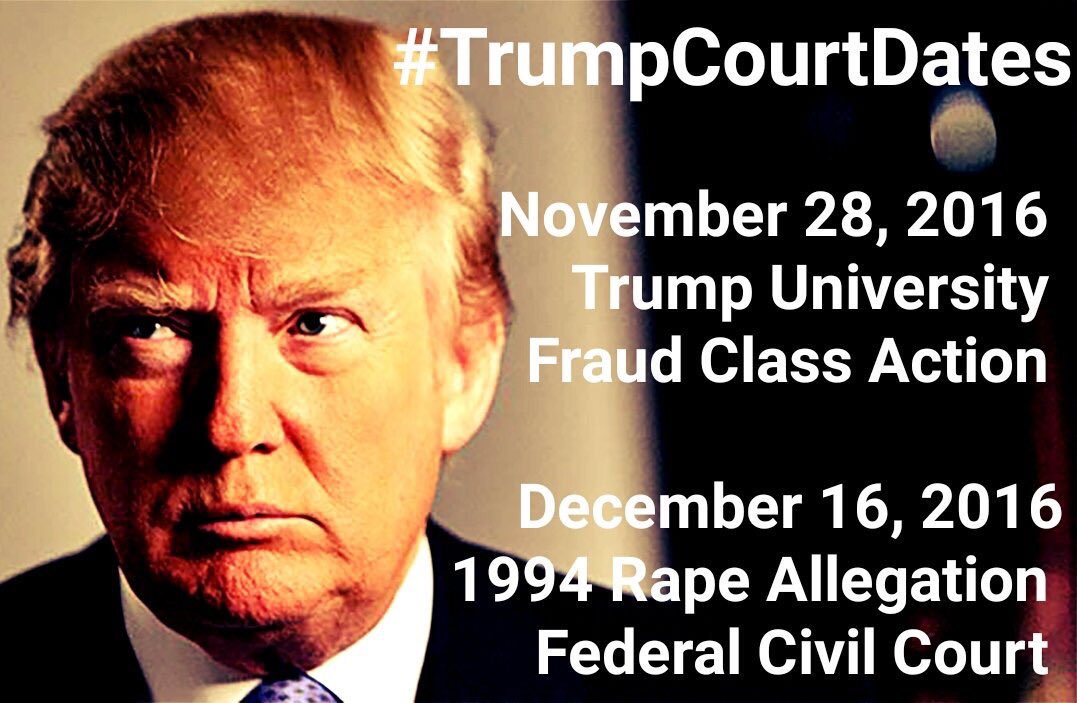方舟子 ?@fangshimin Nov 3 大选过后川普有两起诉讼马上要开庭:11月28日,川普大学涉嫌诈骗的集体诉讼;12月16日,川普被指控在1994年恋童癖阿普斯登聚会上强奸13岁少女的诉讼听证。他要是当了总统,是不是要创下新总统立即要应诉的记录?https://pbs.twimg.com/media/CwYrDPoUQAASWfl.jpg