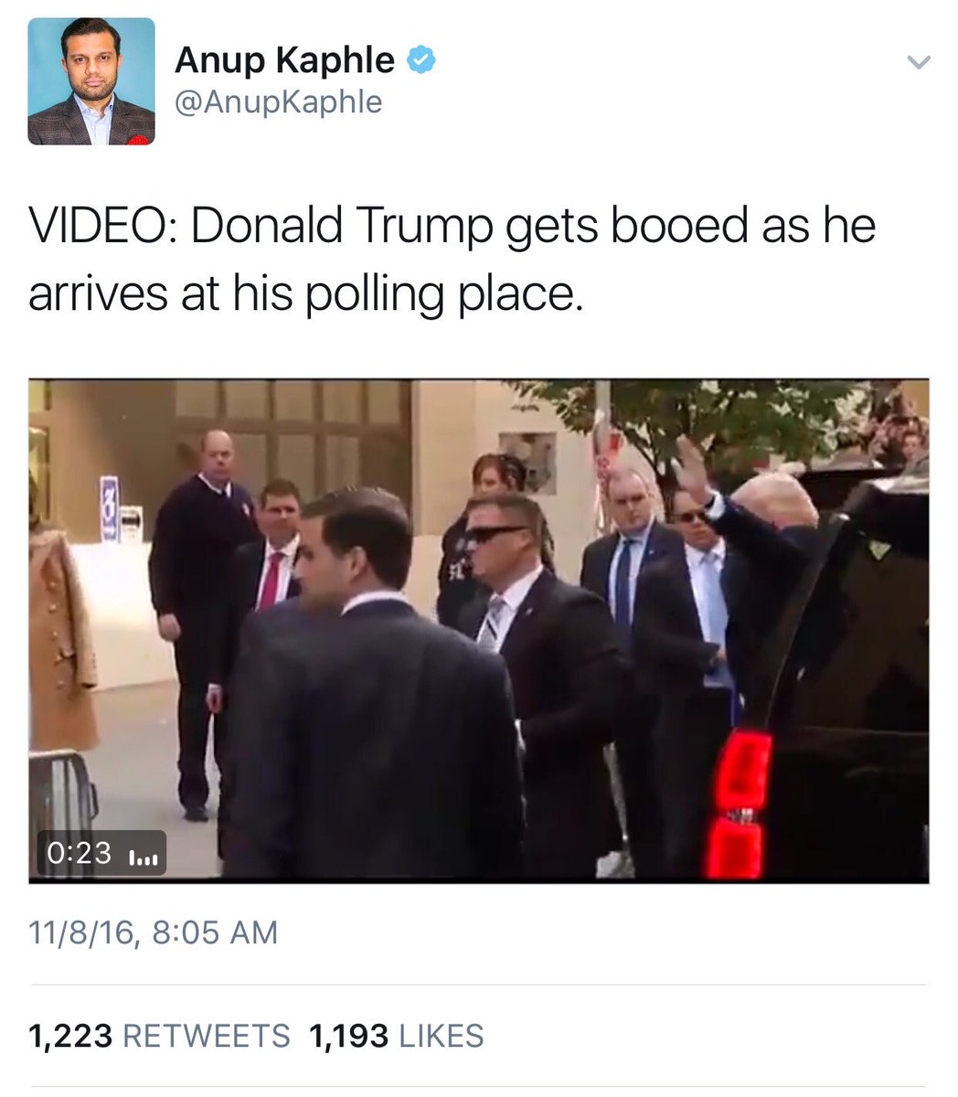 方舟子 ?@fangshimin Nov 8 川普到投票站投票的时候,其他投票的人大声嘘他。还是纽约人民了解他的底细,像布伦伯格说的:“我是纽约人,我看到骗子就知道是骗子。”https://pbs.twimg.com/media/CwwPMfvUQAAFAvl.jpg