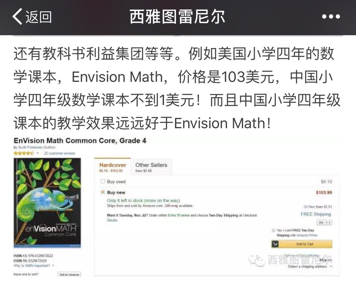 方舟子 ?@fangshimin Nov 23 该川粉在网上随便搜点东西就信口开河大骂美国公立学校。例如他在亚马逊搜到一本小学教材卖103元就骂美国教材贵、钱都被利益集团赚了。其实美国公立小学费用全免,通常不发教科书的,发的话也不收钱,何况同一本新书在亚马逊加盟店大多卖几块、十几块钱。这也能跟中国扯上?作者调查过中国乡村小学?https://pbs.twimg.com/media/Cx_c_2pVEAARJXX.jpg