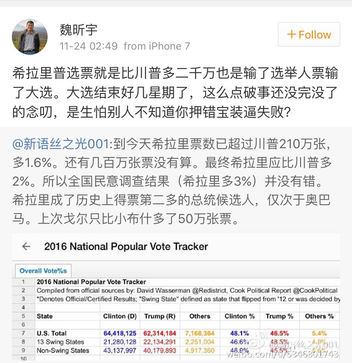 Purple Orange ?@PPLORNG Nov 24 @liuyi61 @fangshimin 那也就是说,如果不算加州,在剩下的49个州加哥伦比亚特区,川普比希拉里多了100万票。这个结果证明了目前的选举人票制度的确能防止选举结果被少数大州操纵。