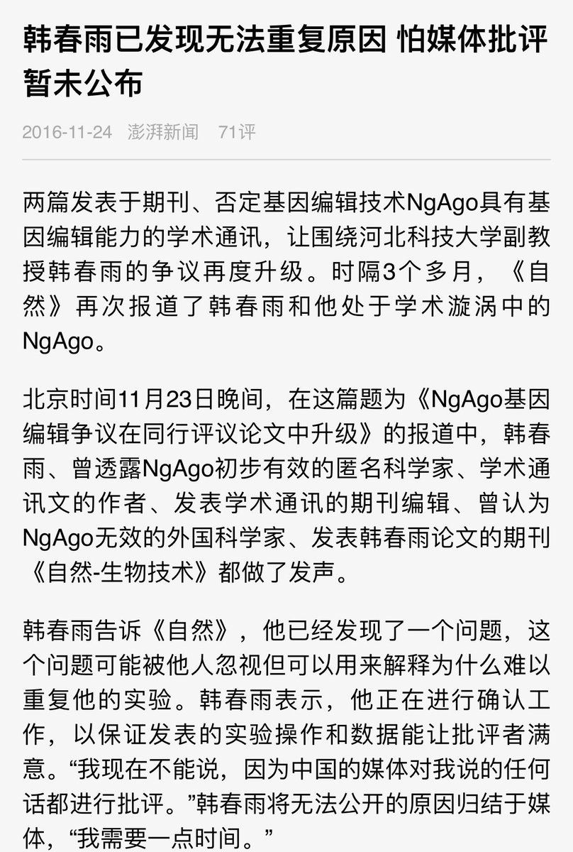 方舟子 ?@fangshimin Nov 23 英国《自然》继续报道韩春雨“基因编辑技术”的争议,采访了我,引用了我两句话。我找个时间翻译。http://www.nature.com/news/ngago-gene-editing-controversy-escalates-in-peer-reviewed-papers-1.21023 …