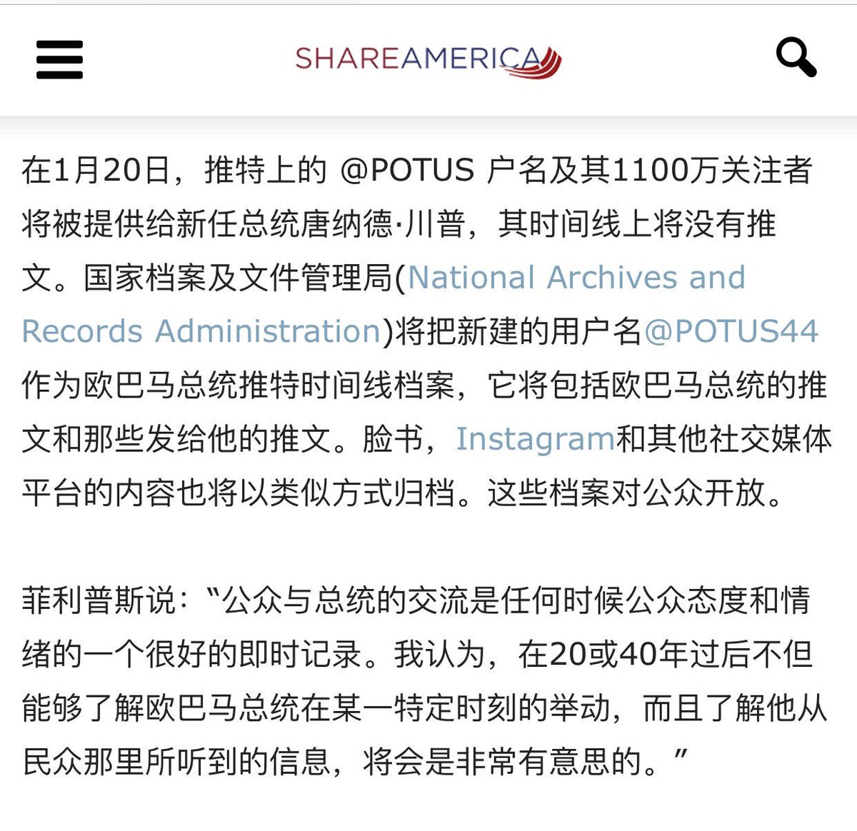 方舟子 ?@fangshimin Dec 2 奥巴马卸任后,将把现在用的美国总统推特号清空交给川普,原来的推特另外建一个推特号保存。https://pbs.twimg.com/media/Cyu1gHJUcAAufax.jpg