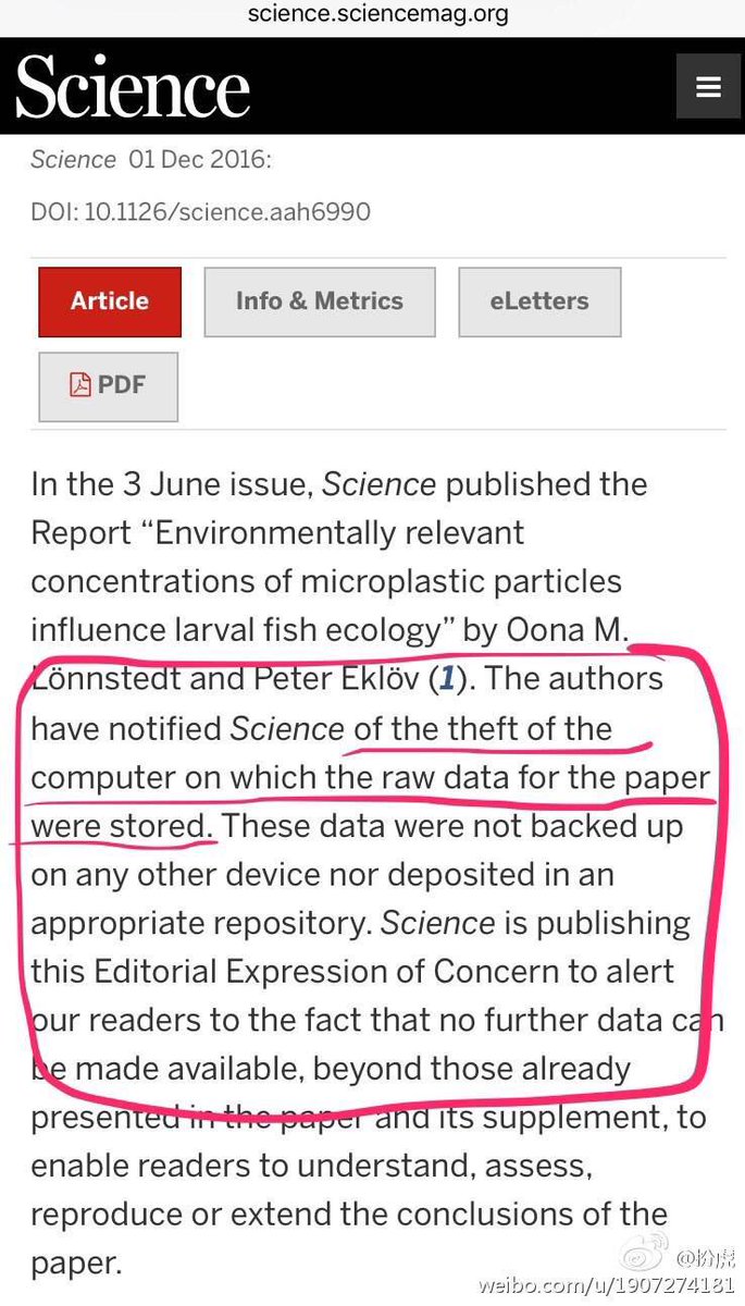 方舟子 ?@fangshimin Dec 3 美国《科学》发表编辑关注说,有一篇论文的原始数据放在笔记本电脑里,该电脑被盗,数据没有备份,不能提供该论文的原始数据。韩春雨得到启发了没有?https://pbs.twimg.com/media/CyzyZL4UQAASkfR.jpg