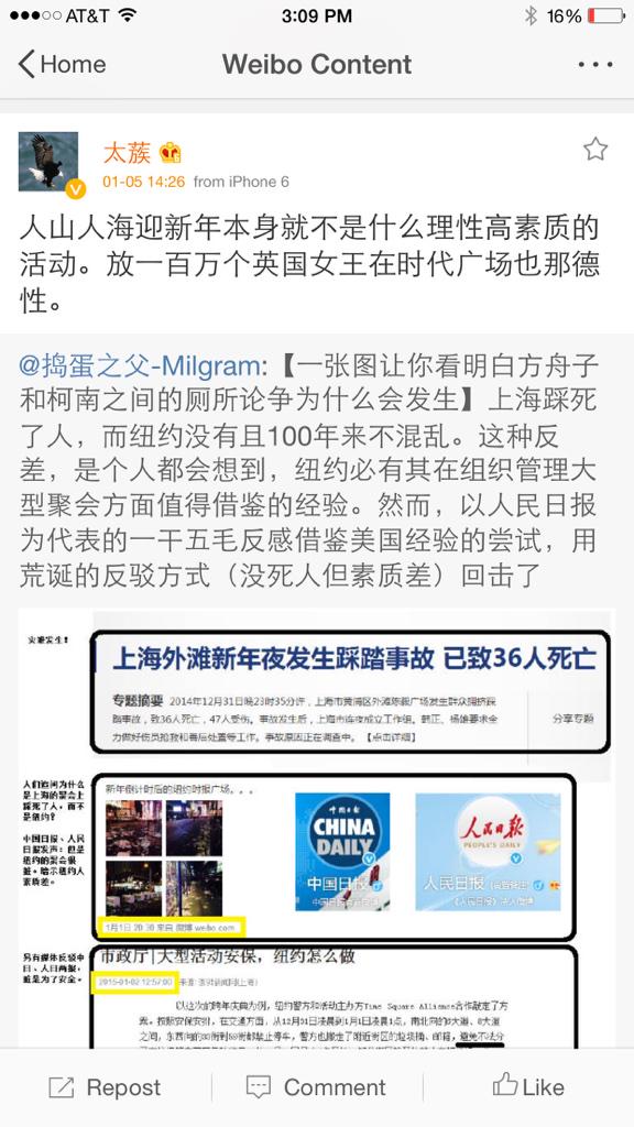 方舟子 @fangshimin · Jan 3时报广场迎新人群的表现与素质无关,纽约居民和游客也不能体现一般美国人的素质,这是一个问题的两个侧面。@neuleonchu