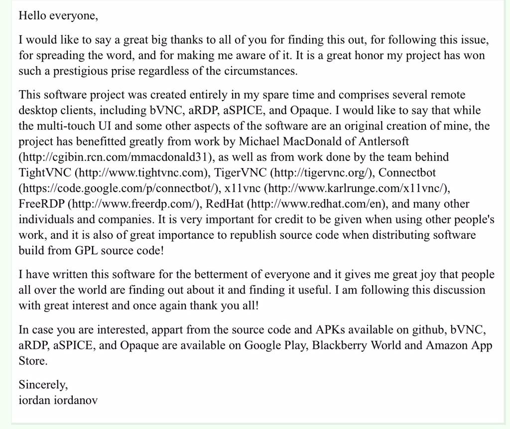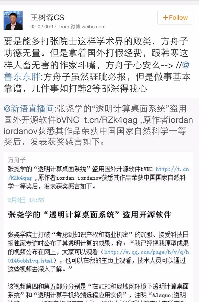 方舟子 @fangshimin · Feb 1张尧学的“透明计算桌面系统”盗用国外开源软件bVNC http://xysblogs.org/yush/archives/11071 … ,原作者iordan iordanov获悉其作品荣获中国国家自然科学一等奖后,发表获奖感言如下。https://pbs.twimg.com/media/B80hT6YCAAAoPBh.jpg:large