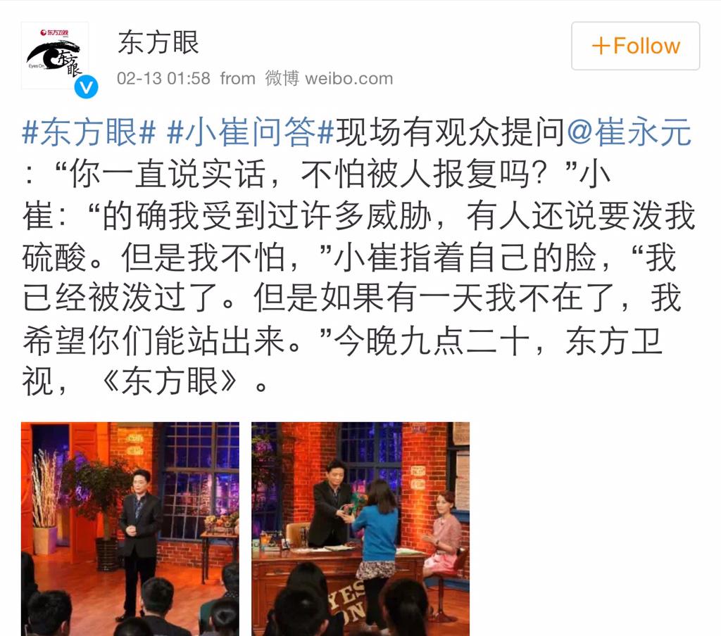 方舟子 @fangshimin · Feb 15崔永元说他脸上被人泼过硫酸?看不出来嘛,难道脸皮是用特殊材料做的?https://pbs.twimg.com/media/B94QgDfCcAAcyZJ.jpg:large