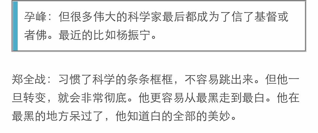 方舟子 @fangshimin · Feb 17杨振宁早辟谣了,还有人在传他信教,显然把那篇冒名的《佛教与科学》当成他写的。不过想想这个“孕峰”相信世上有神仙,曾在微博上直播自己辟谷,如此信谣传谣也就不奇怪了。https://pbs.twimg.com/media/B-F2IaBCEAAEE0Z.jpg:large
