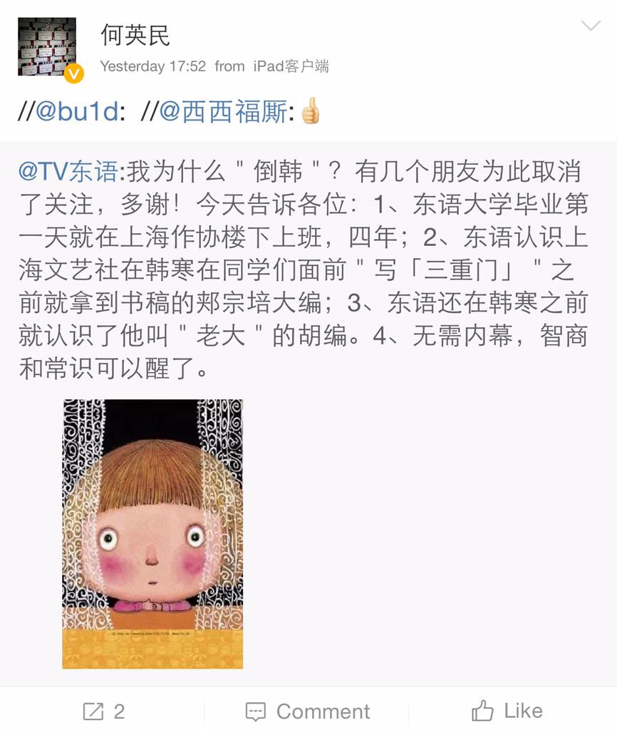 方舟子 @fangshimin · Feb 19虽然识破韩寒无需内幕,有此内幕也是佐料。https://pbs.twimg.com/media/B-RCLOPCcAAIXqC.jpg:large