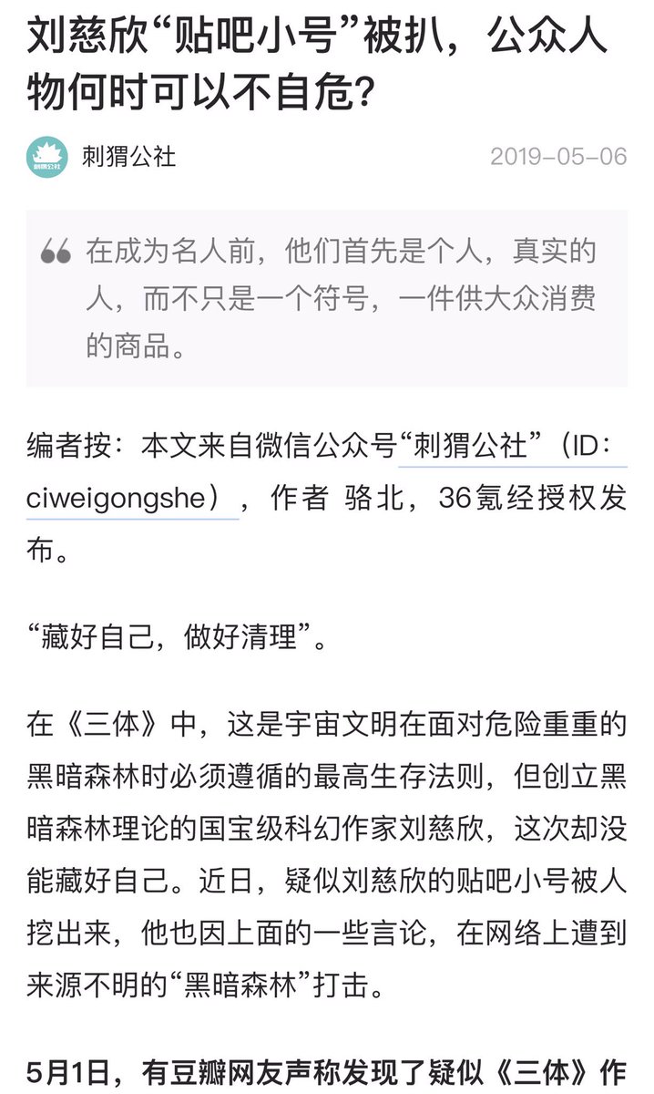 方舟子?Verified account @fangshimin May 8More这人是不是以为公众人物都会像刘慈欣那样用小号吹捧自己、攻击竞争对手,否则何以刘慈欣小号被扒,就觉得公众人物会自危?就像一有男明星被暴有外遇,媒体就以“犯了男人都会犯的错”为其开脱,实际上是侮辱天下男人,此人为了替刘慈欣开脱,也是在侮辱所有公众人物。https://pbs.twimg.com/media/D6F7KzHUYAAX0G_.jpg